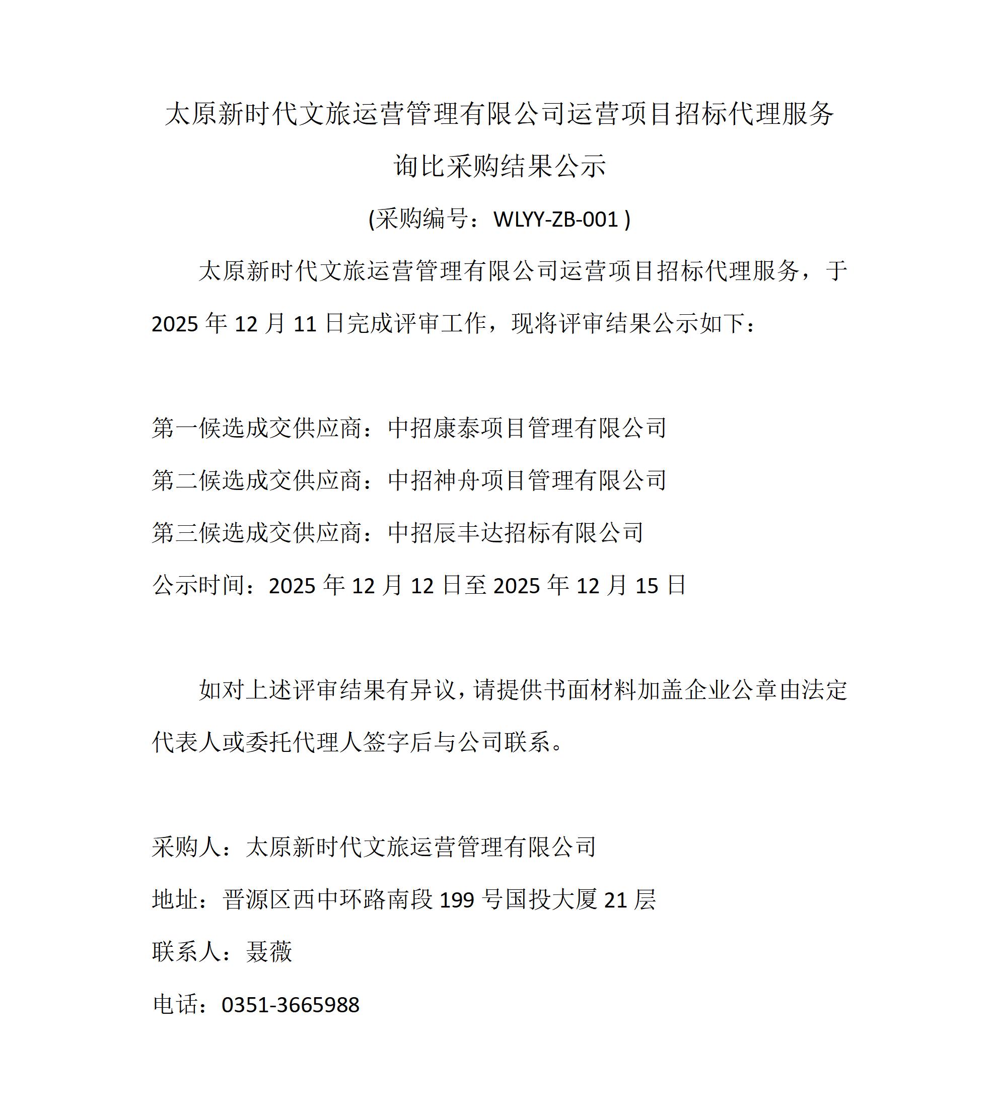 太原新时代文旅运营管理有限公司运营项目招标代理服务采购项目询比采购结果公示