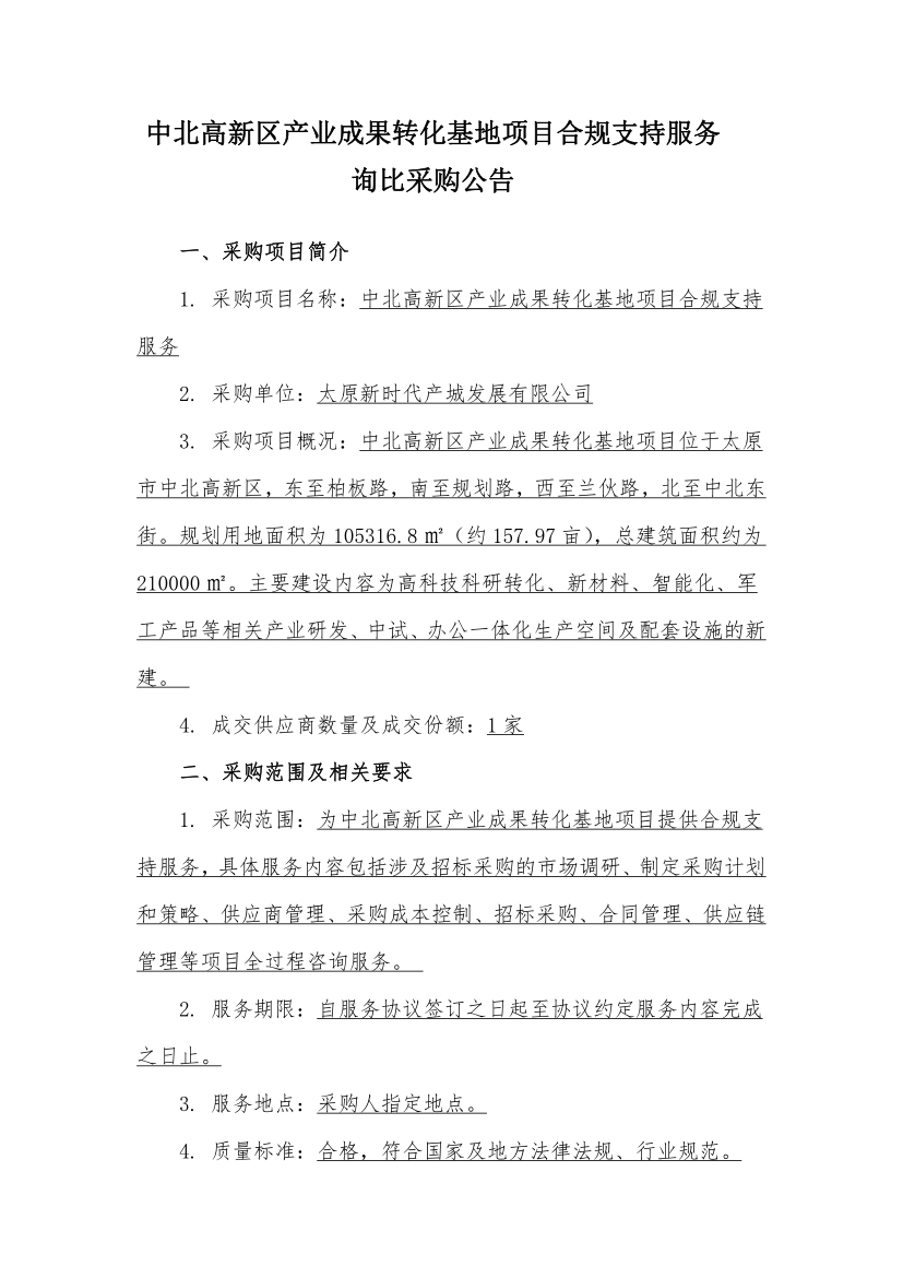 中北高新区产业成果转化基地项目合规支持服务询比采购公告