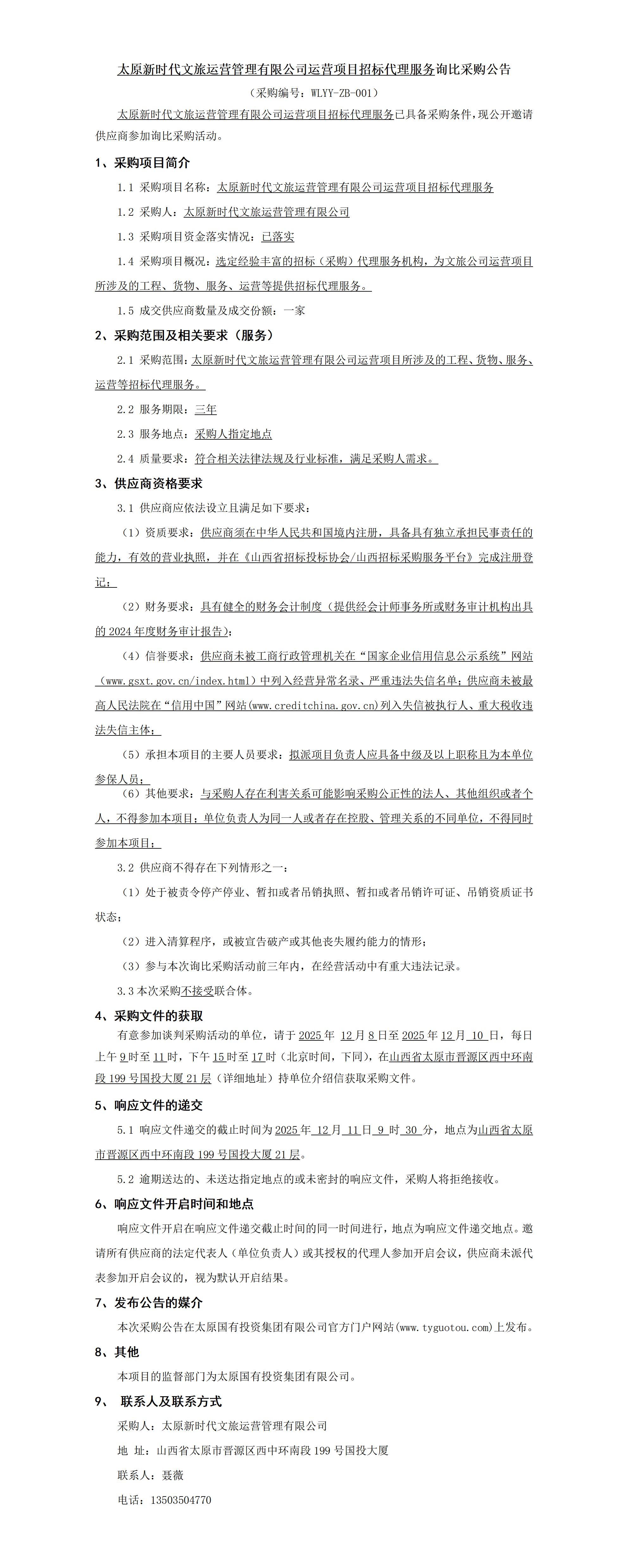 太原新时代文旅运营管理有限公司运营项目招标代理服务询比采购公告